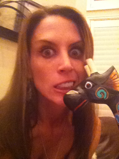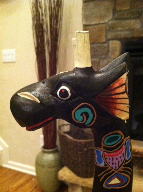 We took my five year old with us to peruse furniture. Kevin immediately became fixated on a chaise lounge and a rug with green circles on it that would compliment his already gay bedroom set, trying to imagine how he would look lying atop it, reading a book on contemporary architecture, drinking a glass of expensive chardonnay, in dry cleaned pajama pants, with a fire burning in August, beneath an original oil painting from a dead artist, eating a plate European cheeses. Bored, my daughter and I wondered around until we came upon some 4’ tall hand painted, wooden black giraffes, with red eyes. Intrigued, I thought to myself “Who in the fuck would buy one of those ugly bastards?” Duh. Me. Because just then my kid walked over to the thing, accidentally knocked it over and sent its ear skittering across the floor.