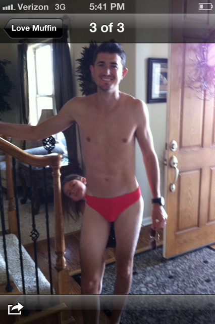 Next subject o’ fun: Mike and I have a couple of wine-making, Europe traveling, celeb mingling, socialite friends named Aaron and Amanda. We have a ton in common. While they were in Cannes recently, Aaron posted a picture on Facebook of him wearing a sausage sling on a yacht. I thought this was absolutely HYSTERICAL so Aaron decided to take it a step further and wore the boner suit over to our house last Sunday. It totally reminded me of the time my mom and stepdad took us to Mexico when I was in college. We were all lying on the beach making fun of some guy climbing out of the ocean wearing a snorkel, mask, flippers and a flesh colored marble sack. We all grew silent as the figure walked over to us and we realized it was Bob. We called him Speedo Bobito for the duration of the trip and for our reward they never took us anywhere again.