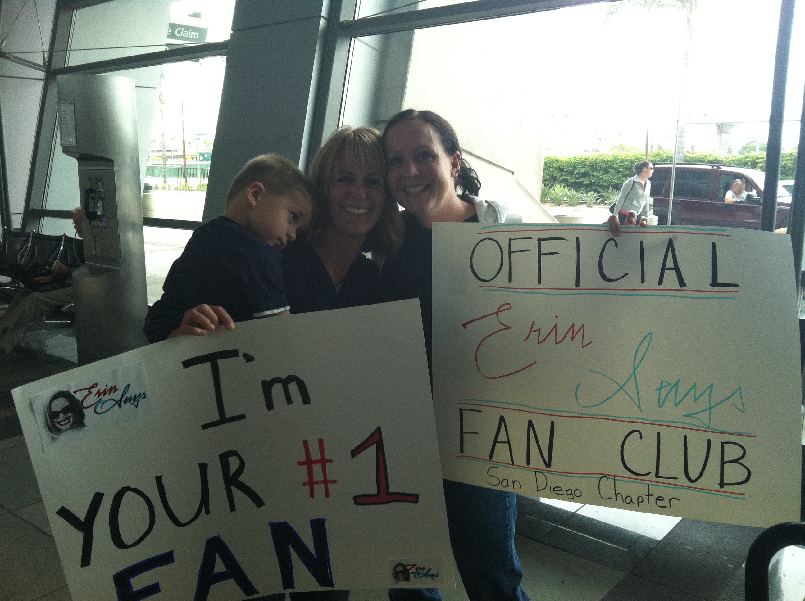 My pitiable saga continued the next day as I flew to California to meet with an editor my dad knew. I walked through the airport with a mournful look on my beaten face. A questionable lesbian even barked “That’s right girl! You leave the bastard!” I solemnly nodded in agreement. In San Diego, my dad met me at the airport along with my 2 confirmed Erinsays fans/stalkers (who I conveniently happen to be related to) holding big signs as I came down the escalator. My dad then made a point of telling everyone that he was “my pimp” and that he had “bitch slapped” me, hence the black eye. OMG.
